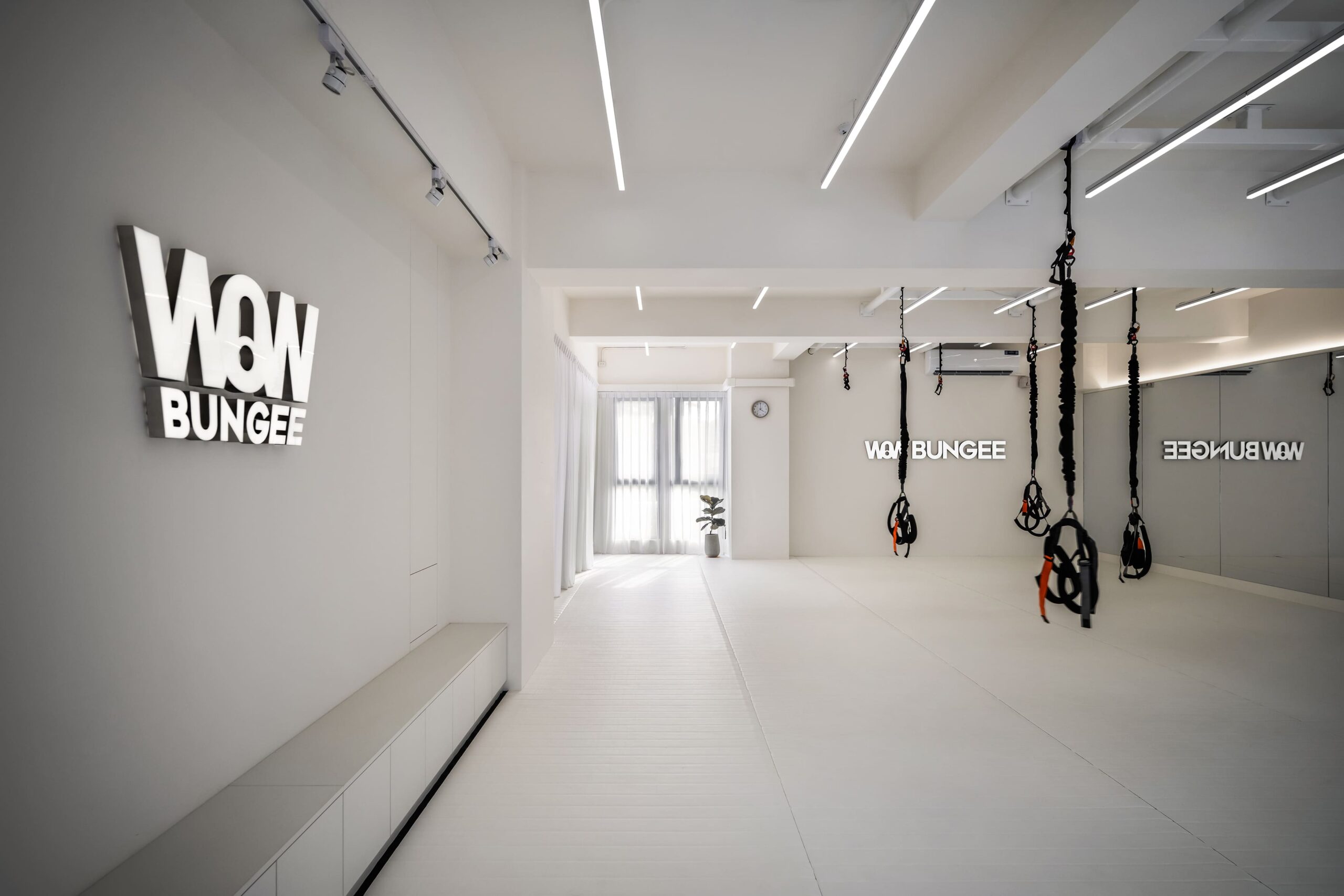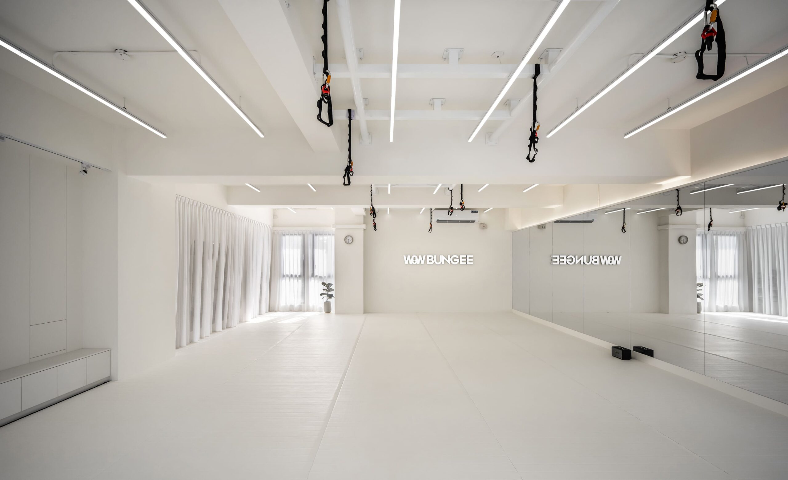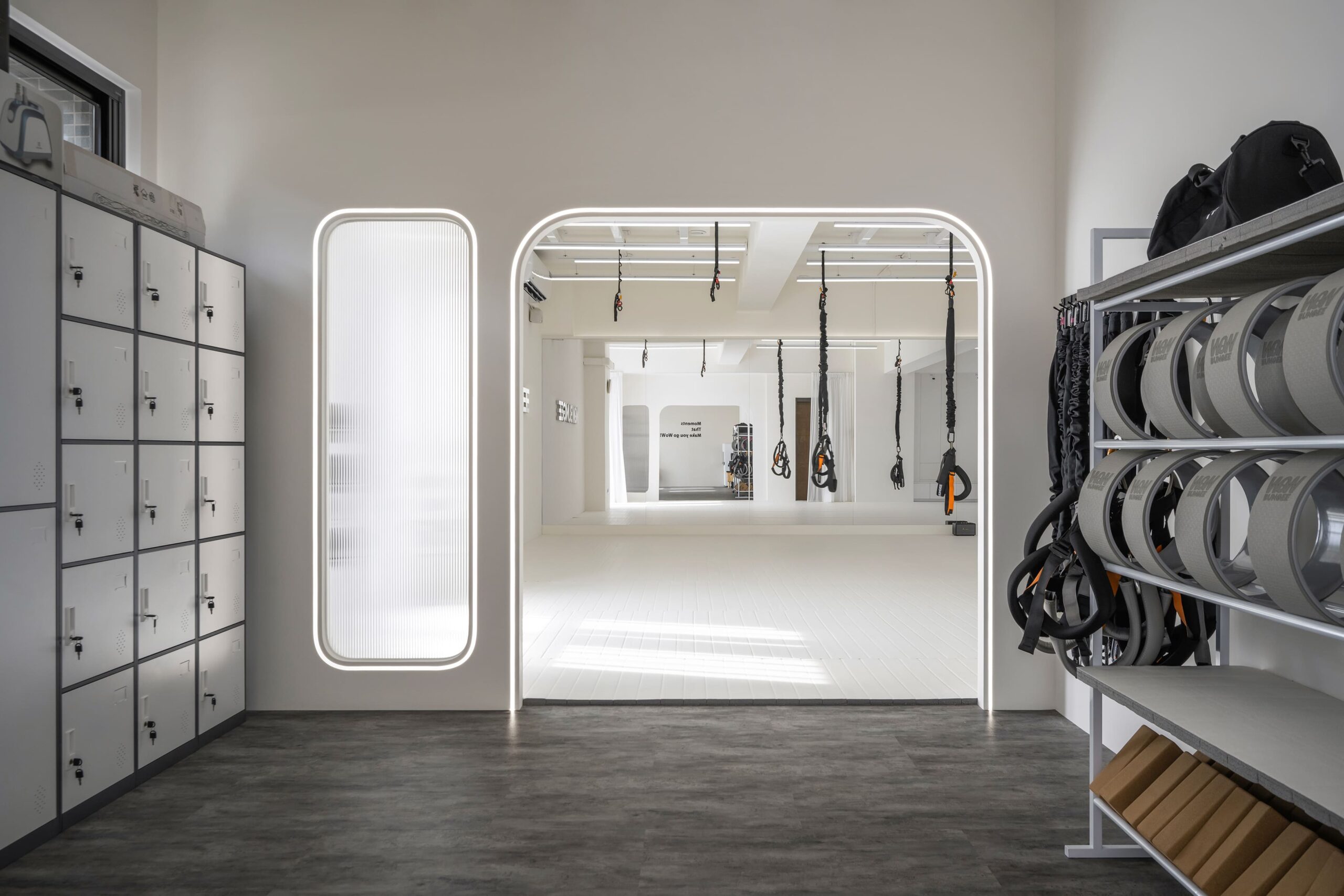 運動區以明亮白色系為基調,搭配整面鏡牆與燈光設計,延伸了空間感,也在視覺上強化動態能量的流動。燈光的規劃不僅具功能性,更成為整體設計語彙的一部分,簡潔俐落,讓學員在訓練中能感受到專注與開闊。